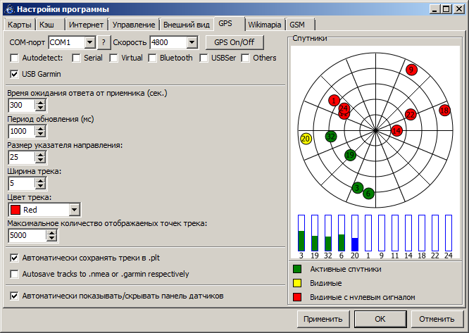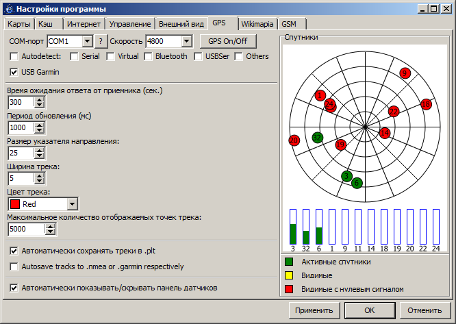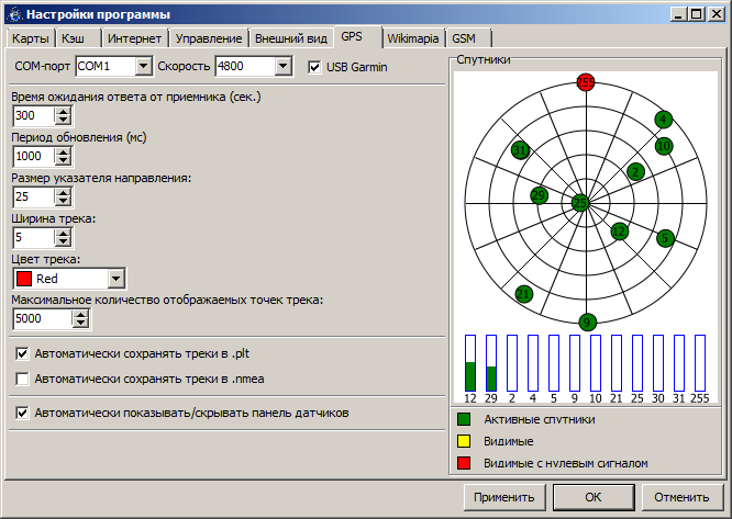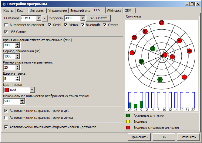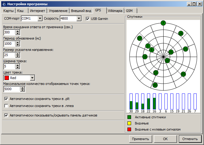 Выложена SASPlanet_04.zip. В принципе с технической стороны вопроса уже близко к итоговому результату. Комментарии: 1. Гарминовские статусы, когда спутник без эфемерид используется для принятия решения, сделал отдельным workaround-ом. Чтобы не нарушать здравую логику, зелёными для гармина считаются спутники с начальными битами 101 (то есть если спутник используется для принятия решения и есть эфемериды). Если же спутник имеет статус 20 (двоичное 10100) или 4 (двоичное 100) - (то есть с точки зрения гармина он нормальный для использования при принятии решения, а с точки зрения логики - не совсем) - будет этакий почти зелёненький, цвет соответствует синенькой окантовке полоски с силой сигнала. На панели датчиков ничего не меняется. Для NMEA ничего не меняется. 2. Напрочь больше не используется второй параметр из настроек gps, задержка в миллисекундах. Пока оставлен, вдруг я чё-то совсем не догоняю. 3. Не могу придумать, как (то есть где именно) лучше отобразить следующую информацию (и надо ли вообще это): а) реально используемый порт при автоопределении COM-порта при подключении; б) человеческое имя девайса, к которому выполнено подключение. 4. Исправлена ещё парочка мелких косяков в парсере NMEA и доделана установка параметров для COM-порта. Надо ли корячить параметры типа чётности и "битности" - тоже непонятно, вроде в сасе этого не было. |
