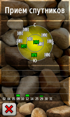 цифры в кружочках - номера спутников, а полоски - уровень сигнала. |