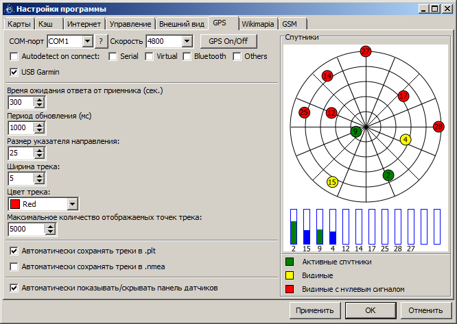 В плане цвета - всё вполне корректно: svid=12, snr=1230, elev=82, azmth=56, status=21 svid=9, snr=2217, elev=29, azmth=184, status=21 svid=29, snr=1690, elev=31, azmth=254, status=21 Это были три имеющихся "зелёных" спутника. У них всё в норме. svid=2, snr=65436, elev=61, azmth=99, status=20 svid=4, snr=65436, elev=29, azmth=50, status=20 svid=5, snr=65436, elev=4, azmth=134, status=20 svid=10, snr=65436, elev=13, azmth=83, status=20 svid=14, snr=65436, elev=11, azmth=278, status=20 svid=25, snr=65436, elev=57, azmth=308, status=20 svid=30, snr=65436, elev=0, azmth=303, status=20 svid=31, snr=65436, elev=8, azmth=326, status=20 svid=27, snr=65436, elev=0, azmth=0, status=4 Это были недоступные спутники - они "красные". Ибо snr меньше нуля (как двухбайтовое число со знаком). В общем-то эта логика была всегда в отрисовке "палочек" и "неба". Другой вопрос - что делать при положительном snr - ибо тогда есть определённое противоречие с логикой и спецификациями гармина (см. выше про биты статуса). Но в этом случае без вариантов "красные". Или хочется дополнительный цвет сделать для snr<0 и "сомнительно-положительного" статуса? Кстати, автодетект работает только по ком-портам. Если юзать исключительно гармин, все прочие автодетектные галочки можно отключить. Всё равно при включённой гарминовской галочке подключение будет именно к нему. |