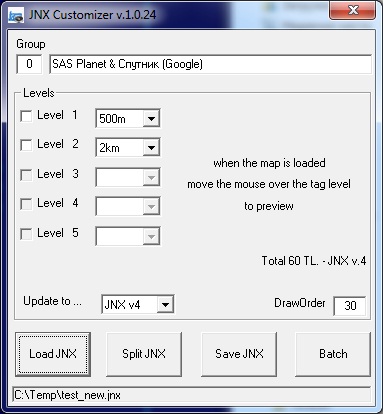 Изначальная форма не верна! При формировании JNX файла (многотомного) нужно иметь возможность не просто указывать уровни зума текущей карты, а нужен список карт и по карте нужный зум. Пример: JNX Level 1 - Яндекс карты Zoom 14 (Отображение на навигаторе с 2км) JNX Level 2 - Генштаб 1 км Zoom 15 (Отображение на навигаторе с 800м) JNX Level 3 - Генштаб 500м Zoom 16 (Отображение на навигаторе с 300м) JNX Level 4 - Генштаб 250м Zoom 17 (Отображение на навигаторе с 120м) JNX Level 5 - Спутник Гугл Zoom 18 (Отображение на навигаторе с 80м) Проще завести List в который добавлять/удалять записи кнопками (Добавить/Изменить/Удалить) Саму запись редактировать в форме. Вот пирог, который не нужно больше обрабатывать ни какими прогами! |