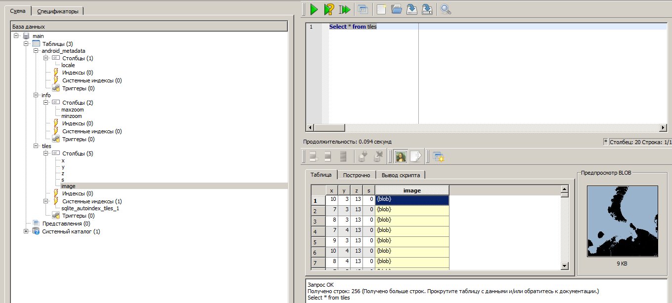 CREATE TABLE tiles ( x int, y int, z int, s int, image blob, PRIMARY KEY (x, y, z, s) ); s входит в первичный ключ. Значит это что-то типа версии, ибо явно для xyz может быть столько разных тайлов, сколько будет разных значений s. зы. В исходниках gmv2sqlite.au3 туда пихается всегда 0. Поддерживаются только jpg и png. В поле зума пишется какой-то понос вида (17 - $zoom + 1). |