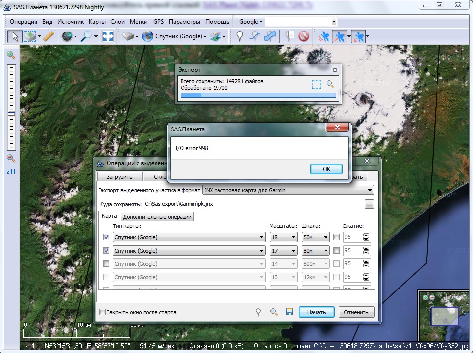 | Description | При экспорте в *.jnx на определённом этапе (после экспорта некоторого количества тайлов) выскакивает ошибка "I/O error 998", причём экспорт этой же области в sas4winCe/sas4android, rmaps(sqlite) и в ogf2 происходит без ошибок. Ошибка проявляется на последних ночных сборках. | ||||||||