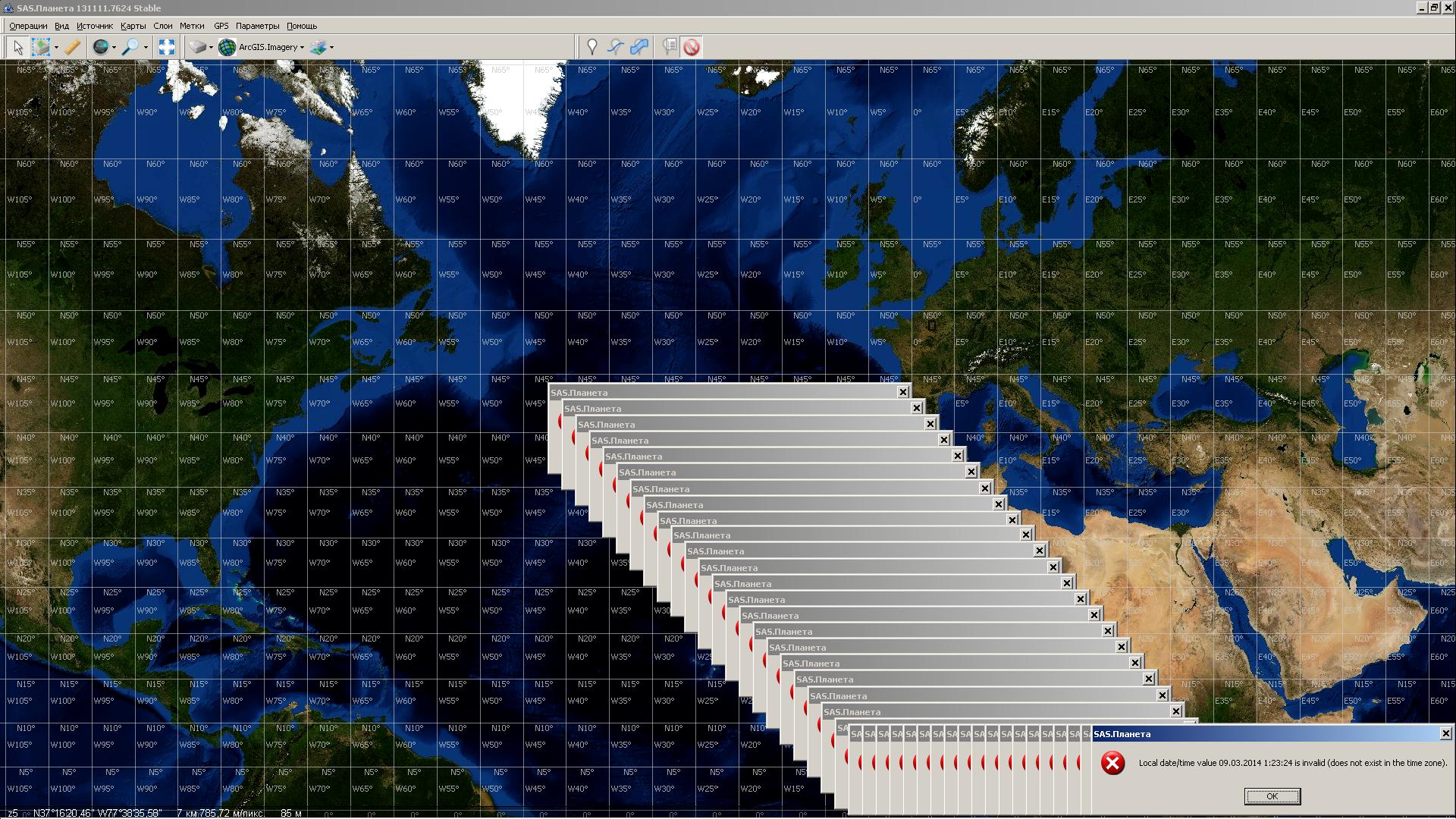 | Description | При наведении курсора мыши на область севернее экватора и западнее 80 градусов западной долготы - происходит зависание программы с выпадением множества окошек с надписью "Local date/time value 09.03.2014 [текущее время] is invalid (does not exist in the time zone)." Закрыть программу можно только через диспетчер задач. | ||||||||