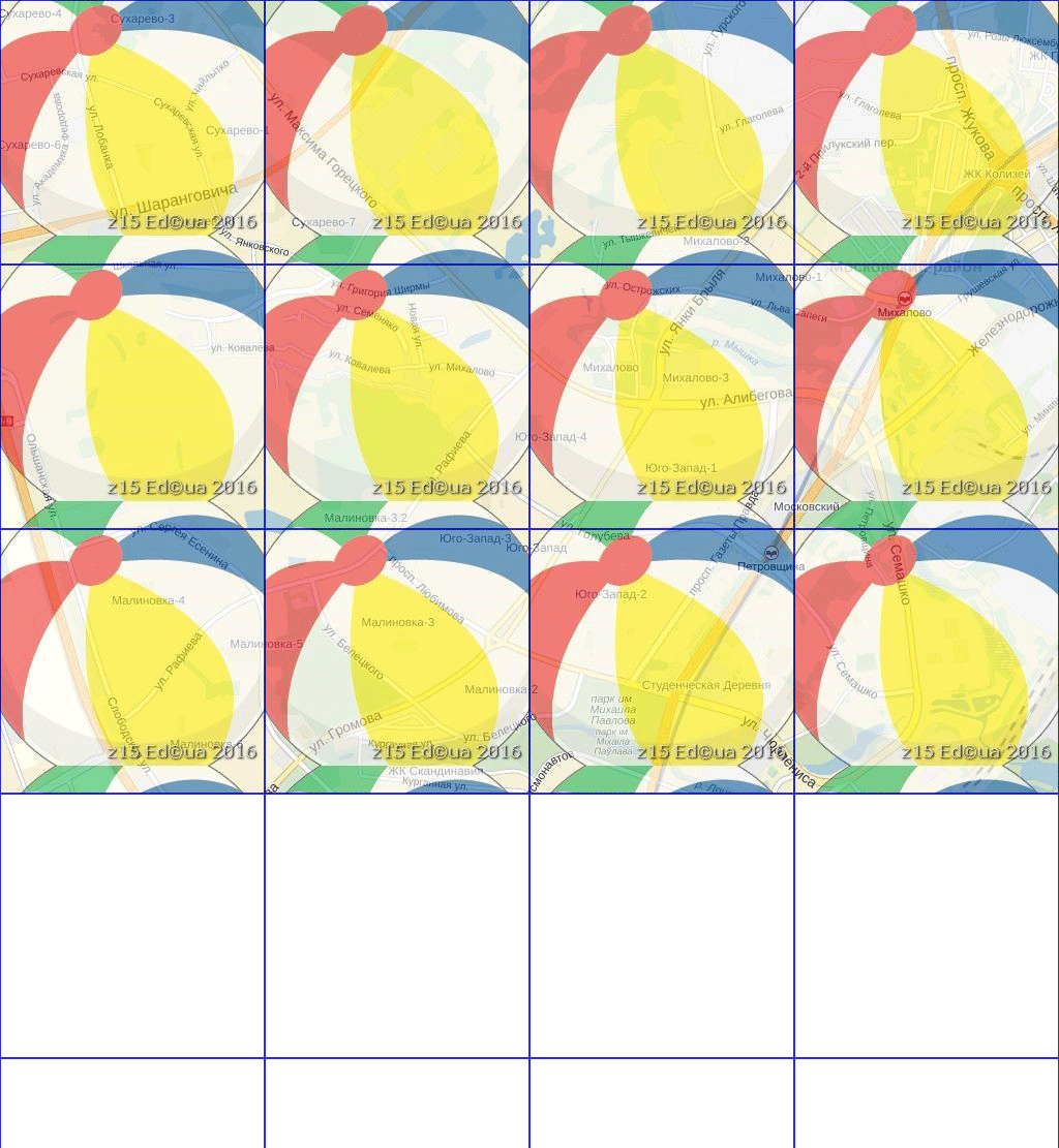 Cиним - сетка тайлов первого, большего контейнера .а00 Если фрагменты карты совместить то видно, что тайлы фрагмента со второго .а00 смещены по вертикали относительно тайлов первого фрагмента |