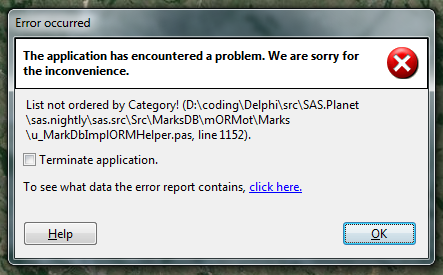 | Description | Выдаётся ассерт: List not ordered by Category! (D:\coding\Delphi\src\SAS.Planet\sas.nightly\sas.src\Src\MarksDB\mORMot\Marks\u_MarkDbImplORMHelper.pas, line 1152). | ||||||||