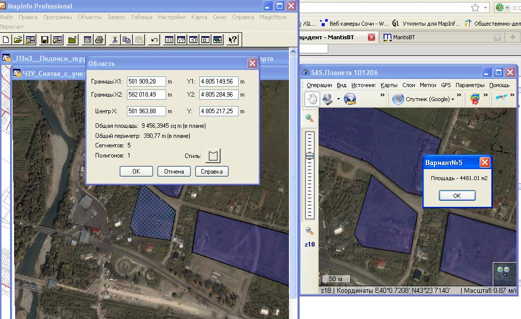 | Description | Неправильный подсчёт площади полигона на разных картах/снимках. Рисую полигон при помощи встроенного рисователя, проверяю периметр - периметр правильный, проверяю площадь - площадь в САС Планете почти в ДВА раза меньше реальной. То есть при просмотре/подсчёте площади и периметра в МапИнфо 9.5, периметр совпадает, а площадь в МапИнфо - в ДВА раза больше. | ||||||||