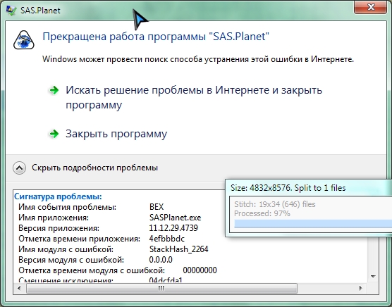 | Additional Information | Вылетает по системному сообщению. Прекращена работа программы SAS.Planet.