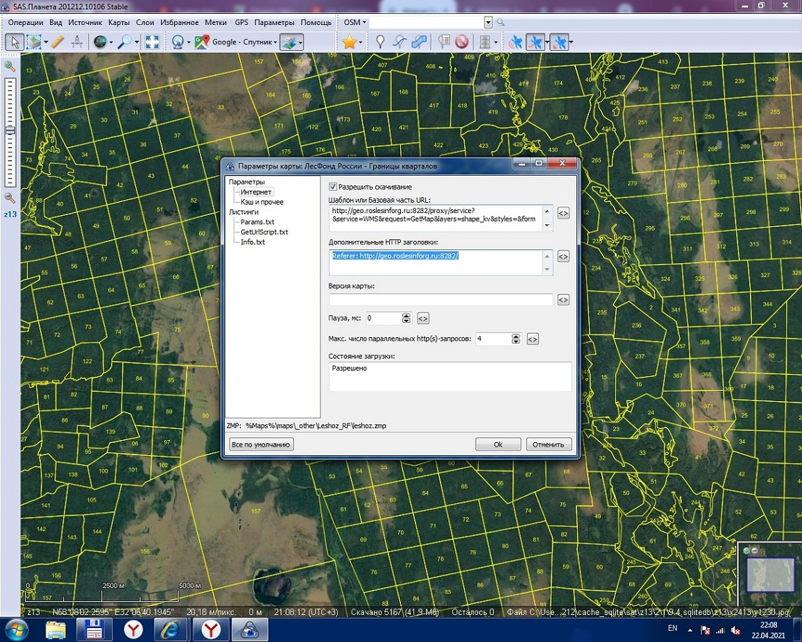 Параметры - Параметр Слоя - ЛесФонд России вкорячить: Шаблон или базовая часть: http://geo.roslesinforg.ru:8282/proxy/service?&service=WMS&request=GetMap&layers=shape_kv&styles=&format=image/png&transparent=true&version=1.1.1&width=256&height=256&srs=EPSG:3857&bbox= Дополнительные HTTP заголовки: Referer: http://geo.roslesinforg.ru:8282/ |