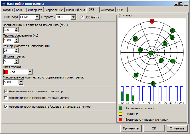Выложена SASPlanet_04.zip. В принципе с технической стороны вопроса уже близко к итоговому результату. Комментарии: 1. Гарминовские статусы, когда спутник без эфемерид используется для принятия решения, сделал отдельным workaround-ом. Чтобы не нарушать здравую логику, зелёными для гармина считаются спутники с начальными битами 101 (то есть если спутник используется для принятия решения и есть эфемериды). Если же спутник имеет статус 20 (двоичное 10100) или 4 (двоичное 100) - (то есть с точки зрения гармина он нормальный для использования при принятии решения, а с точки зрения логики - не совсем) - будет этакий почти зелёненький, цвет соответствует синенькой окантовке полоски с силой сигнала. На панели датчиков ничего не меняется. Для NMEA ничего не меняется. 2. Напрочь больше не используется второй параметр из настроек gps, задержка в миллисекундах. Пока оставлен, вдруг я чё-то совсем не догоняю. 3. Не могу придумать, как (то есть где именно) лучше отобразить следующую информацию (и надо ли вообще это): а) реально используемый порт при автоопределении COM-порта при подключении; б) человеческое имя девайса, к которому выполнено подключение. 4. Исправлена ещё парочка мелких косяков в парсере NMEA и доделана установка параметров для COM-порта. Надо ли корячить параметры типа чётности и "битности" - тоже непонятно, вроде в сасе этого не было. |