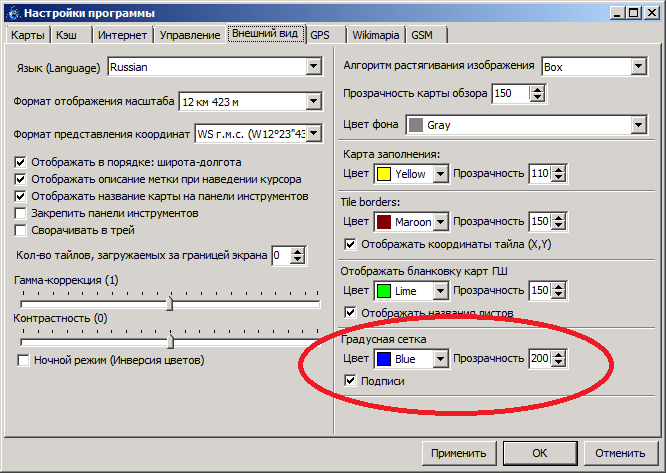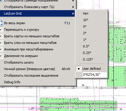 Идеально было бы , чтобы можно было выбирать шаг такой же как градусная сетка в номенклатуре карт ГШ, и плюс к этому задавать вручную. Да и цвет линий сетки еще бы хорошо бы уметь настраивать. А то - плохо видно. Ну и цифровое отображение значений градусных координат не всегда надо - иногда мешается, загромождает картинку, видно, надо, чтобы отключалось. |