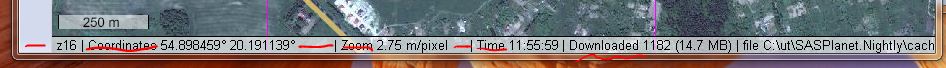 Начиная с версии 120225.5095 появилась возможность отключить ненужные поля через SASPlanet.ini: [StatusBar] ZoomInfo=0 LonLatInfo=1 MetrPerPixInfo=0 TimeZoneTimeInfo=0 DownloadInfo=1 HttpQueueInfo=1 TilePathInfo=1 |