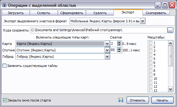| Description | Пытаюсь сделать экспорт выбранной области в последний (на данный момент) МЯК, задаю соответствие для слоев (см. вложение), выполняется экпорт. НО на выходе имеем только 2 слоя (вместо трех). После заливки карт в телефон (nokia 5800), МЯК позволяет выбрать новый слой, загружает изображения, и при любых действиях падает (зум, прокрутка) user.xml -------------- <?xml version="1.0" encoding="utf-8" ?> <map_layers> <l id="12" request="" name="Гибрид (Яндекс.Карты)" service="0" size_in_pixels="128" ver="1" /> <l id="11" request="" name="Карта (Яндекс.Карты)" service="0" size_in_pixels="128" ver="1" /> </map_layers> -------------- | ||||||||