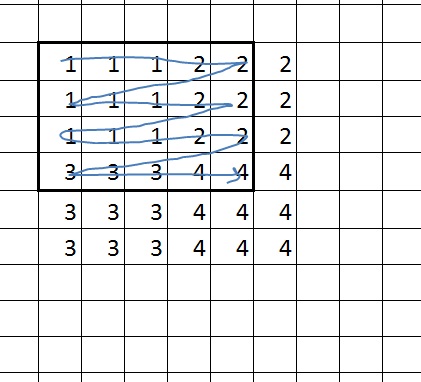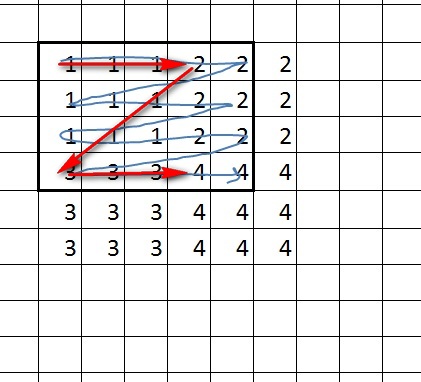 Ни к чему перебирать все, надо только верхний левый угол (красными стрелками). Как пиш.машинка или сасовская качалка (сначала сверху вниз) - без разницы. |