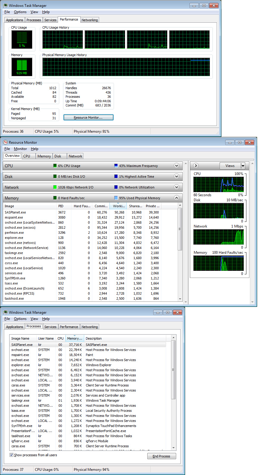 | Description | Версия 121010 аналогично! При запуске программы резервируется около 30-100Мб оперативной памяти под процесс и эта цифра изменяется не сильно. Но общий объём доступной оперативной памяти начинает снижаться, со скоростью примерно 0,5Мб/сек. Через некоторое время вся доступная физическая память оказывается задействованной. После выхода из SAS.Planet процесс sasplanet.exe выгружается практически мгновенно, а доступная физическая память начинает увеличиваться примерно с такой же скоростью, с какой уменьшалась. Через некоторое время (более 10мин) объём оперативной памяти приходит к состоянию до запуска. | ||||||||