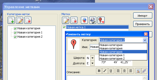 | Description | Если сделать две или более категории с одинаковыми именами, то в диалоге "Управление метками" будет доступна только одна из них. При этом, в свойствах меток по-прежнему виден весь список. | ||||||||