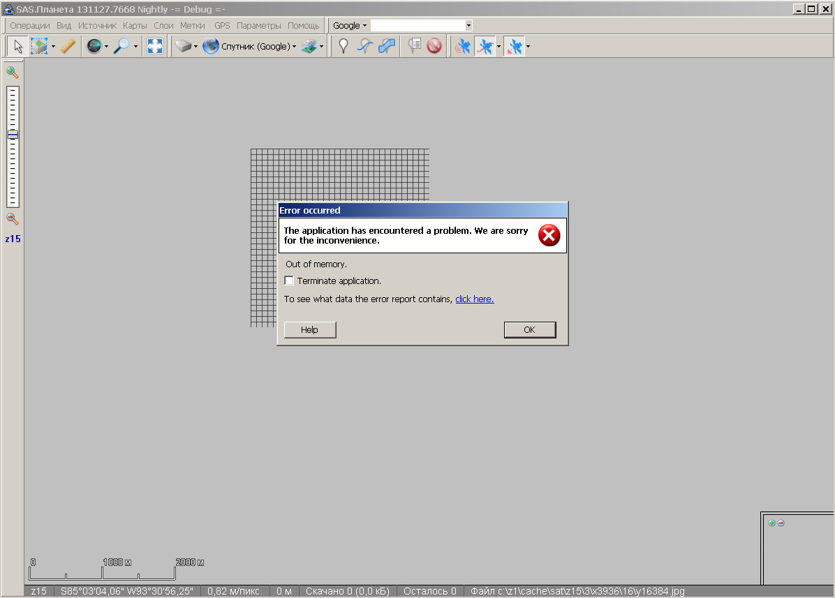 >Ну хоть бы описал что делал. На чистой ночнушке 131223.7762 изменяю две настройки: включаю отображение границ тайлов для активного масштаба и выбираю источник «только кэш». Ставлю курсор на серое поле чуть выше и левее обзорной карты и вращаю колесо мыши, увеличивая зум. На z24 жду 2-3 секунды, не выполняя никаких действий. Получаю две ошибки «координата X пиксела не может быть меньше нуля» (131223_a_SASPlanet.Debug.elf). Закрываю программу и запускаю ее снова. Во время запуска программы получаю ошибки Assertion failure и Memory Leak (обе ошибки в файле 131223_b_SASPlanet.Debug.elf). |