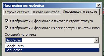 Постепенно замысел начал до меня доходить. Сейчас опишу, если где ошибусь - плиз, поправьте. 1. Чтобы это работало, должен быть доступ к кэшу GC или GE. Если ни один из этих кэшей не доступен, опции выбора их становятся серыми. Также серыми становятся опции "Отображать информацию о высоте" в других местах меню. И тогда п. 2 работать не будет совсем. 2. Если нажать кнопку "Отключить", то включить обратно этой же кнопкой не получится, а нужно нажать на один из источников данных GC/GE. Итак, отображение высоты имеет следующие опции: отображать/не отображать, GC/GE/оба источника. Для управления всеми этими опциями достаточно всего двух галок на названиях источников. Ни одной галки - не отображать, одна галка - отображать из этого источника, две галки - отображать из обоих источников. Если впоследствии возникнет ещё какой-либо источник для отображения высоты, его нужно будет просто добавить к двум имеющимся со своей галкой. |
