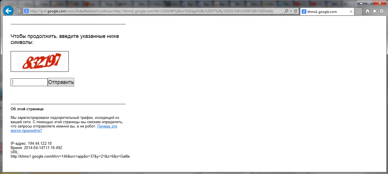 CAPTCHA - http://captcha.ru/ После скачивания большого количества тайлов - Гугл банит IP адрес на сутки, или более, если часто повторяется. Но если непосредственно в браузере открыть ссылку на конкретный тайл (SAS.Планета\"Копировать в буфер обмена"\"Ссылку на тайл основной карты") то появляется запрос на подтверждение что запросы отправляете именно вы, а не робот. В этом то окне и надо ввести код и продолжить загрузку. Собственно можно добавить этот функционал в саму SAS.Планету и вводить код подтверждения в окне SAS.Планети, а не копировать ссылки в другие браузеры, что не всегда эффективно. |