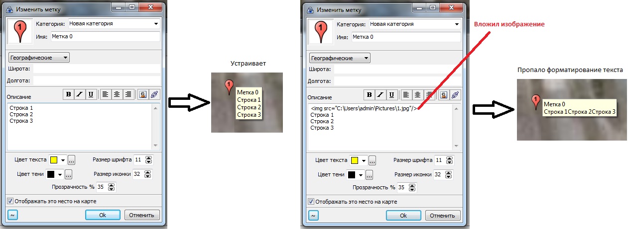| Description | Если в описании метки используется < b r / > вместо < b r >, то эти переносы строк игнорируются при отображении хинта и текст выводится в одну строку | ||||||||