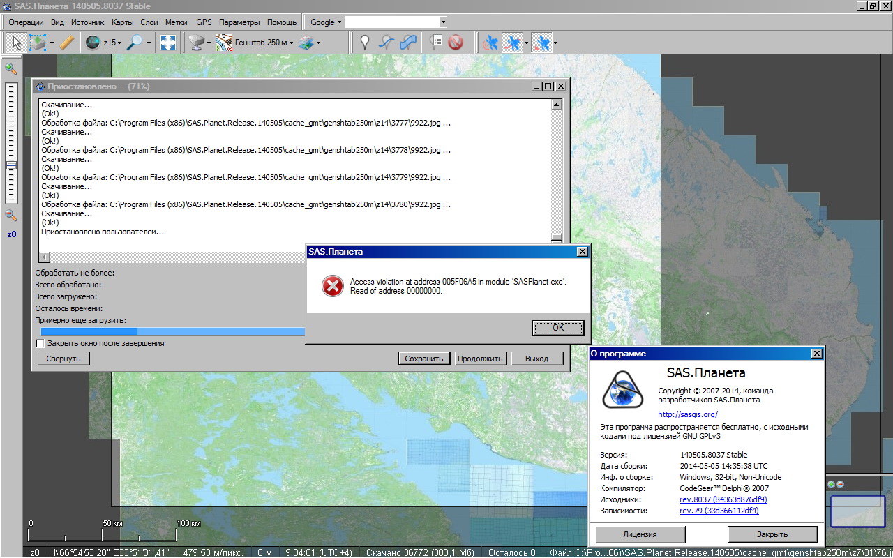 | Description | Итак, версия 140505: 1. Выбрал область, операции с выбранной областью, вкладка загрузить (на всякий случай - генштаб 250, 15 масштаб, остальное по умолчанию). 2. загружает... 3. выбрал пауза, сохранить. сохранил, вышел. 4. запустил планету снова, выбираю открыть - открыл, пошла загрузка. 5. опать пауза, сохранить, презепись ? да. и тут access violation см. скриншот в аттаче. 6. при открытии этого сеанса - no sls data. зы. спасибо за проект! вы лучшие! | ||||||||