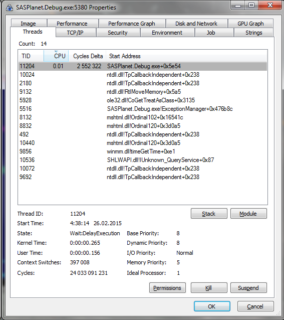 Приложил тестовый билд. Инструкция к действию: - распаковать архив в папку с ночнушкой, с заменой файлов - запустить DbgView.exe - запустить SASPlanet.exe (в DbgView полетят строки, при наличии сетевой активности) - словить баг - сделать скриншоты стеков, такие же что уже висят в этом тикете - сохранить содержимое DbgView - рядом с exe так же появится лог файл вида "SASPlanet 20150228 132225.log" (такой файл будет создаваться при каждом запуске, главное не перепутать и прислать самый последний) Потом возвращайтесь сюда и будем смотреть дальше. Да и нужна информация о том, как SAS ходит в интернет. Через прокси или нет, какие выставлены там настройки. |