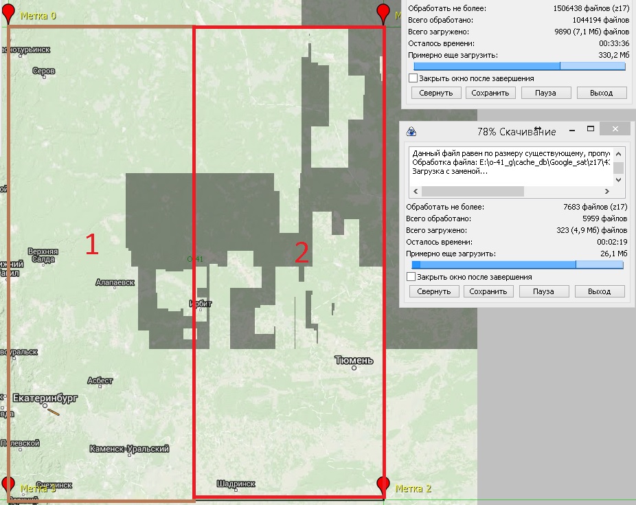 | Description | Некоторые карты, например Google-ландшафт очень долго скачивают. Приходится качать в два потока: Один поток качает с левой границы до середины, второй - с середины до правой границы (см. рисунок). Хотелось бы иметь возможность указать программе как скачивать - слева-направо или справа-налево. Таким образом два потока будут качать навстречу друг-другу. Ну а то что всё скачано, можно будет понять по записям в окошке "Этот файл уже есть в кэше". | ||||||||||||