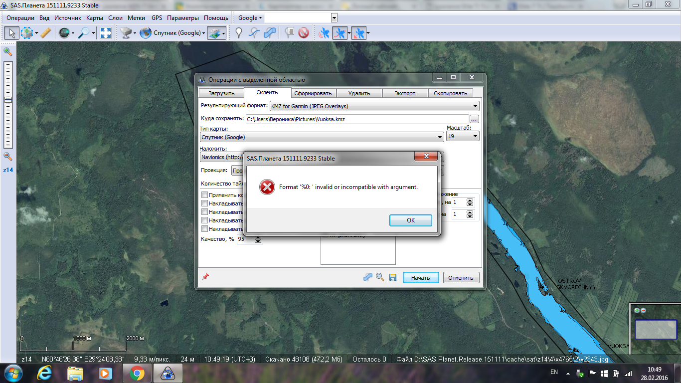 | Description | Постоянно выскакивает ошибка при попытке склеить в .KMZ на масштабах больше 14. Google (спутник) + Navionics | ||||||||