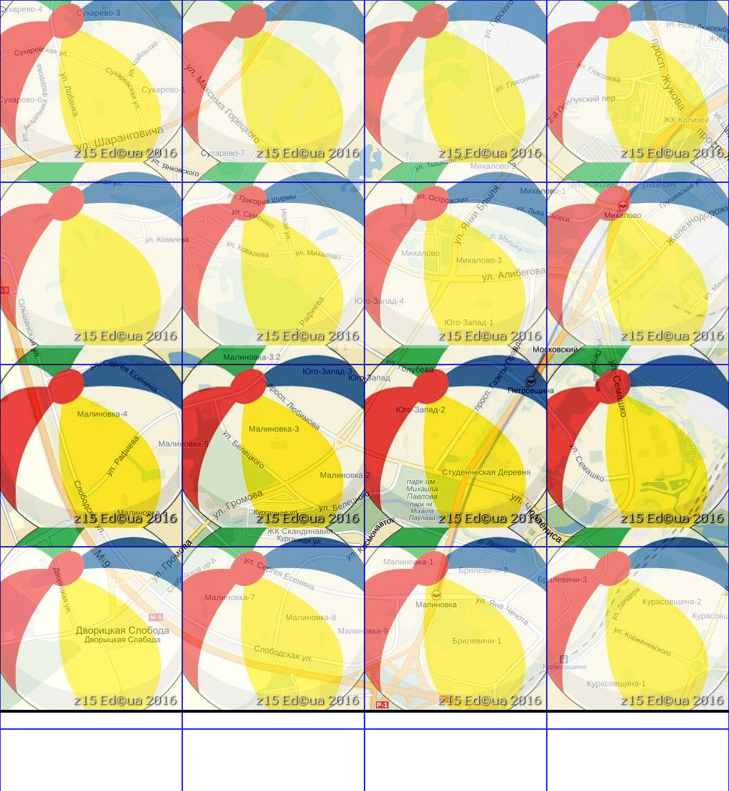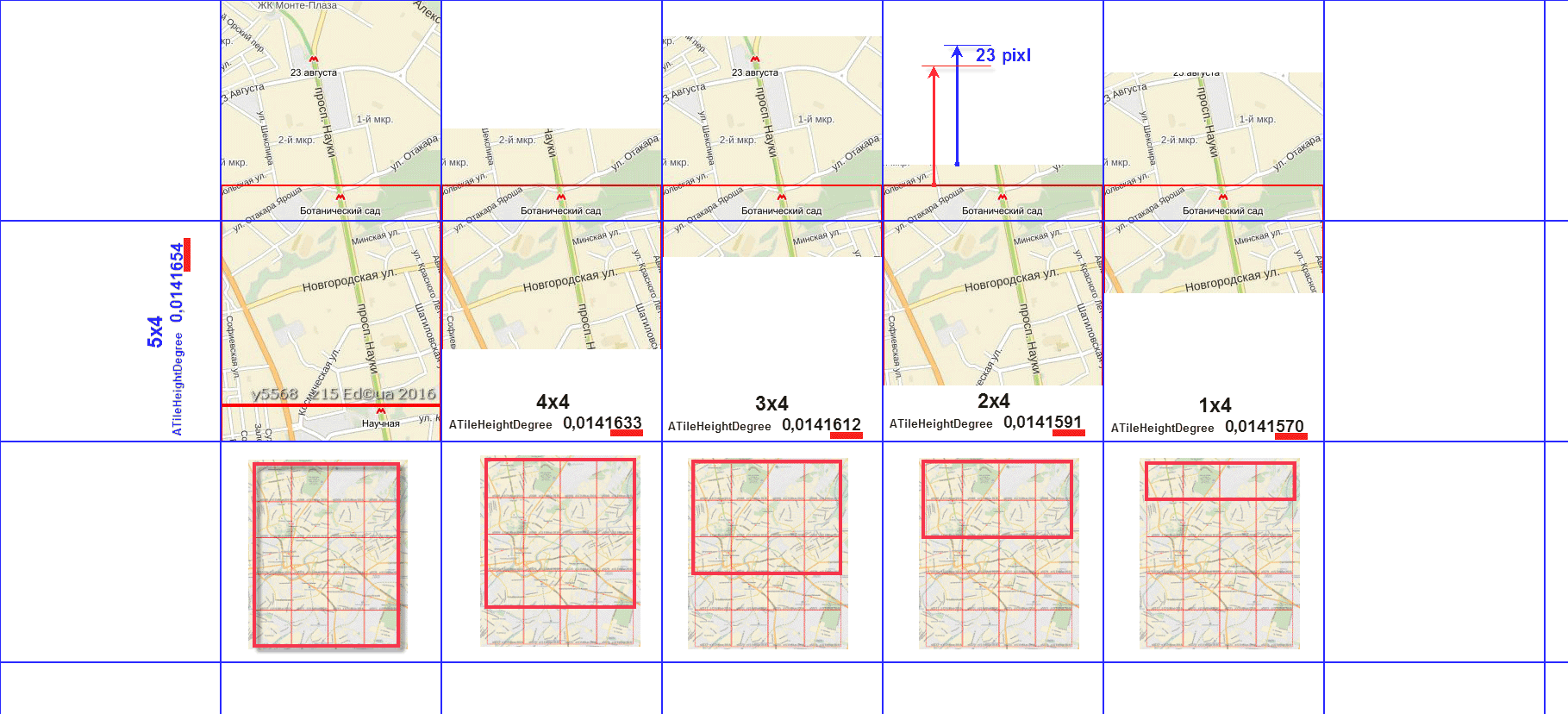 Cиним - сетка тайлов первого, большего контейнера .а00 Если фрагменты карты совместить то видно, что тайлы фрагмента со второго .а00 смещены по вертикали относительно тайлов первого фрагмента |
