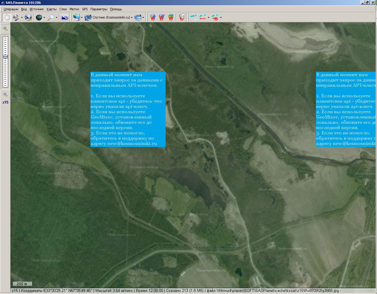 | Description | При рассмотрении поверхности земли(спутник kosmosnimki.ru) некоторые тайлы не отображаются, вместо них висит синий баннер с текстом "В данный момент нам приходит запрос за данными с неправильным API-ключом" | ||||||||