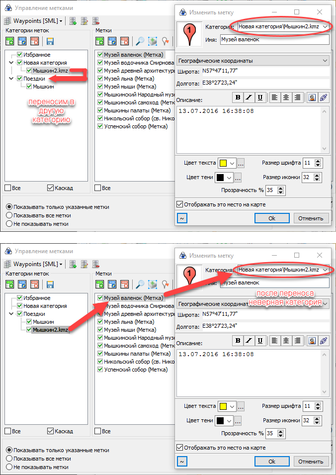 3. Открываем любую метку из Поездки\Мышкин.kmz и видим, что вверху проставляется старое имя категории. Если нажать на ОК, метка исчезнет и появится на старом месте только после перезапуска программы.