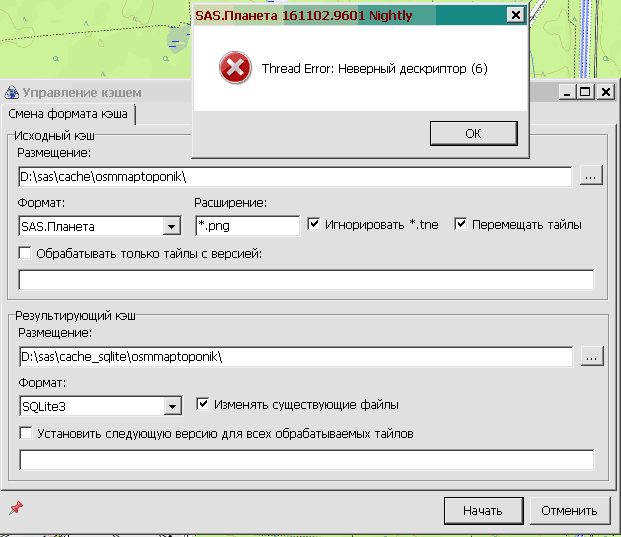 | Description | В параметрах карты переключил на тип кэша с умолчания на СКЛайт. Потом запустил управление кэшем, чтобы переместить существующие тайлы в "новый" формат. Получил ответ про неверный дескриптор. На картинке. От положения "птичек" в меню результат не меняется. Запустил дебажную версию, результат тот же, лога САСДБ не создано. | ||||||||