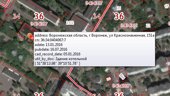 Данные берутся из публичной кадастровой карты (ПКК)- https://pkk5.rosreestr.ru Например 36:34:0404067:7 Площадь: 1 389 кв.м (area) Кадастровая стоимость:3 719 422,53 руб. |