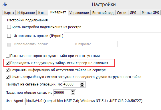 В настройках уже есть такая опция - "Переходить к следующему тайлу, если сервер не отвечает" (надо снять галочку). А "Отсутствует подключение к интернет" (при наличии Интернета) обычно возникает если сервер вас забанил за слишком агрессивное скачивание. И тут, переходи к следующему тайлу или нет - толку всё равно не будет, пока сервер не снимет бан. |