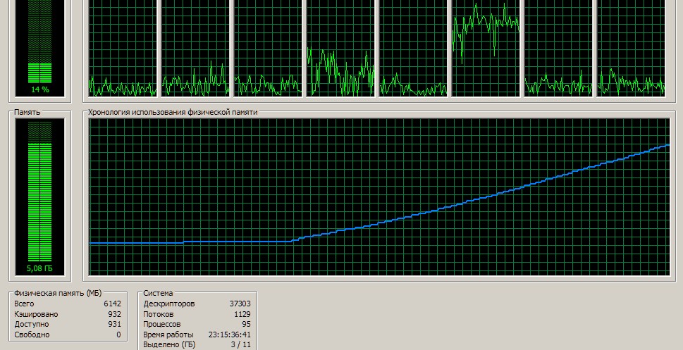 Поставь Process Explorer и добавь сюда скриншоты вкладки Performance информации о процессе САС до начала проверки и когда память уже заметно выросла. Ну хотя бы до 4-5 гигов. Еще на всякий случай уточни кэш лежит чисто локально или где-то на сетевом диске. |