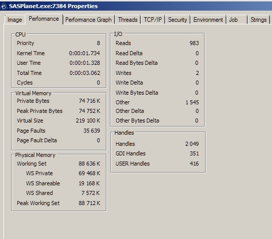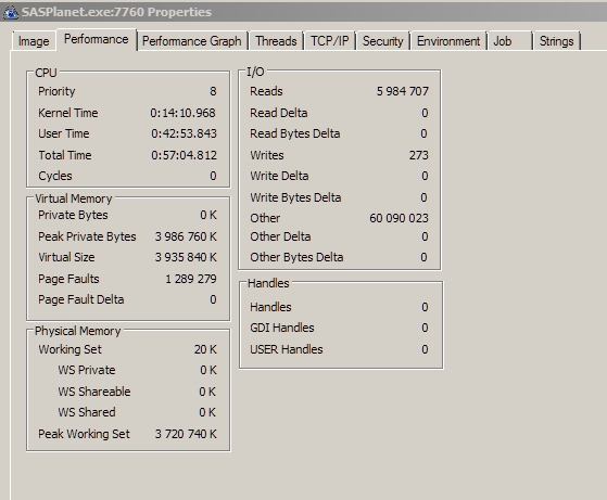 1. Скрины с PE докинул. Good.jpg - сразу после старта САСа, bad.jpg - когда вылезло сообщение "Out of memory" - см.ниже. 2. Проблема повторяется и на кэше SQLite в той же мере (скрины с него, соббсно). Проверялся БОЛЬШОЙ кэш в SQLite, тип файлов - PNG, 100% заполнение (все тайлы - в кэше). Проверка шла в 4 потока (стоит галка "Разбить закачку....4 потока") + галка "Закрывать окна по окончании загрузки". Примерно через час работы занятая САСом память доросла до 4х гигов (см.скрин), в окнах загрузки побежали сообщения "Недостаточно памяти для завершения операции" и затем процесс в окнах остановился. При попытке выйти с САСа - вылезло окно "Out of memory", в итоге - выход по 3м кнопкам. |