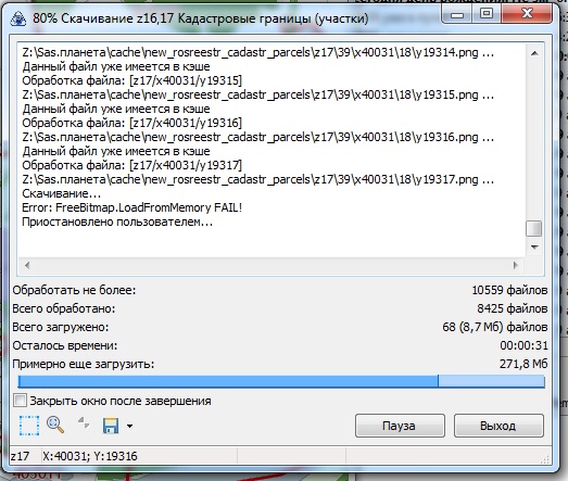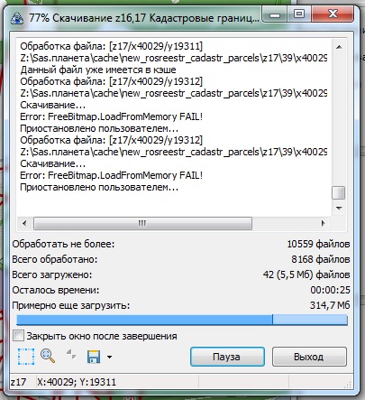 на жестком диске 9ГБ свободного места. кэш скачивается с нуля с пропуском уже скаченных тайлов. ошибка одинокого появляется как с использованием кэша Sqlite так и с обычным кэшем sas.планеты. |