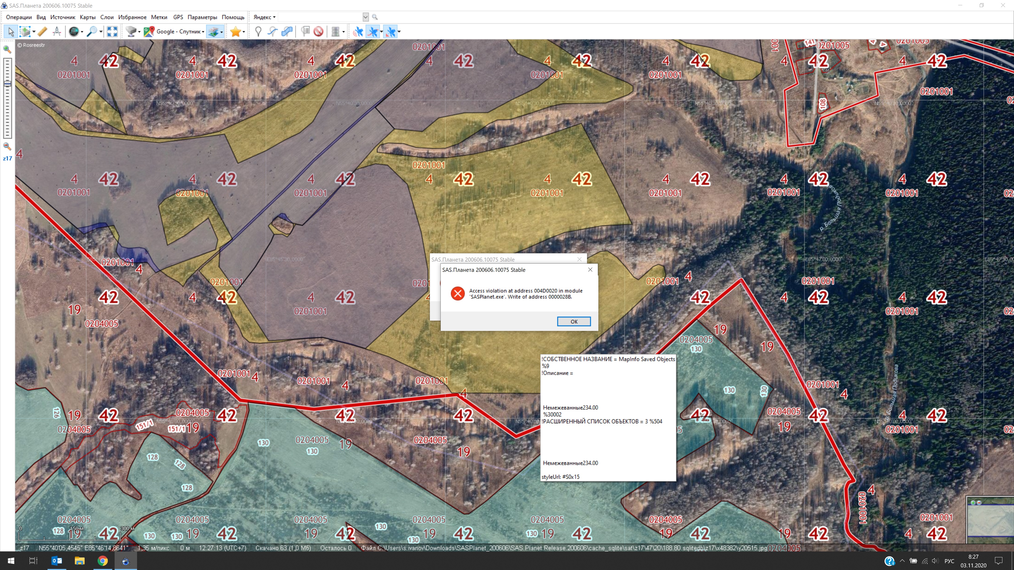 | Description | Добрый день! Посмотрите пожалуйста ошибку. Раньше выпадало редко, сегодня начинает выдавать очень часто. Ошибку ловлю при создании меток - при просмотре все нормально вроде. Access violation at address 004D0020 in module SASPlanet.exe. Write of address 0000028B. | ||||||||