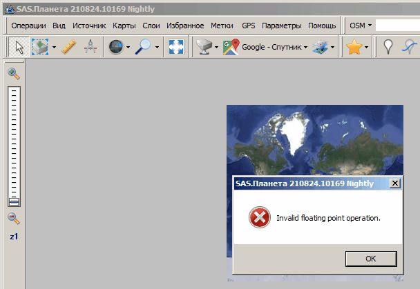 | Description | При выборе проекции "Geographic Lat/Lon" и дальнейшей работой с картой вылазит ошибка"Invalid Floatig Point Operation". Происходит это при малом масштабе, когда весь мир на экране (например самый-самый первый запуск программы), либо когда ползаешь по карте в верхних широтах 85+ Ошибка не пропадает, выскакивает постоянно, пока двигаешь мышью. В момент появления диалогового окошка мышка "прилипает" к полю карты и уползти обратно в "нижние" широты получается с трудом. Если закрыть программу в этот момент, то при следующем запуске она "теряет" карту (серое поле), которая выбрана. В меню Вид-Проекция остаётся только один вариант - "Оригинальная (из ZMP)". Вывести из ступора программу можно, удалив ini-файлы. | ||||||||