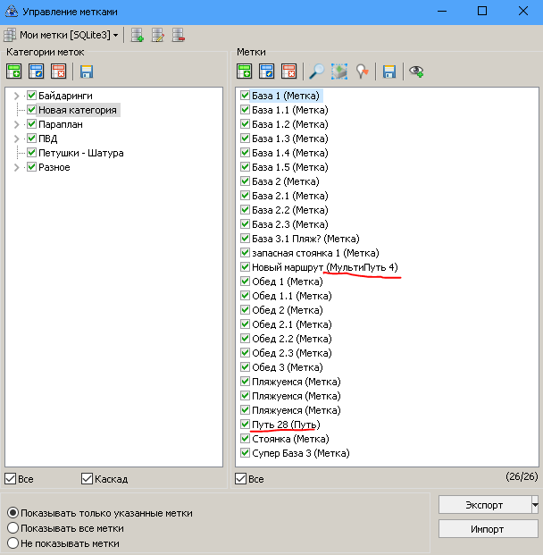 | Description | Небольшая хотелка - сделать раздельное выделение меток и (мульти)путей в выбранной категории. Как вариант - справа от "Все" добавить "Метки" и "Пути". | ||||||||