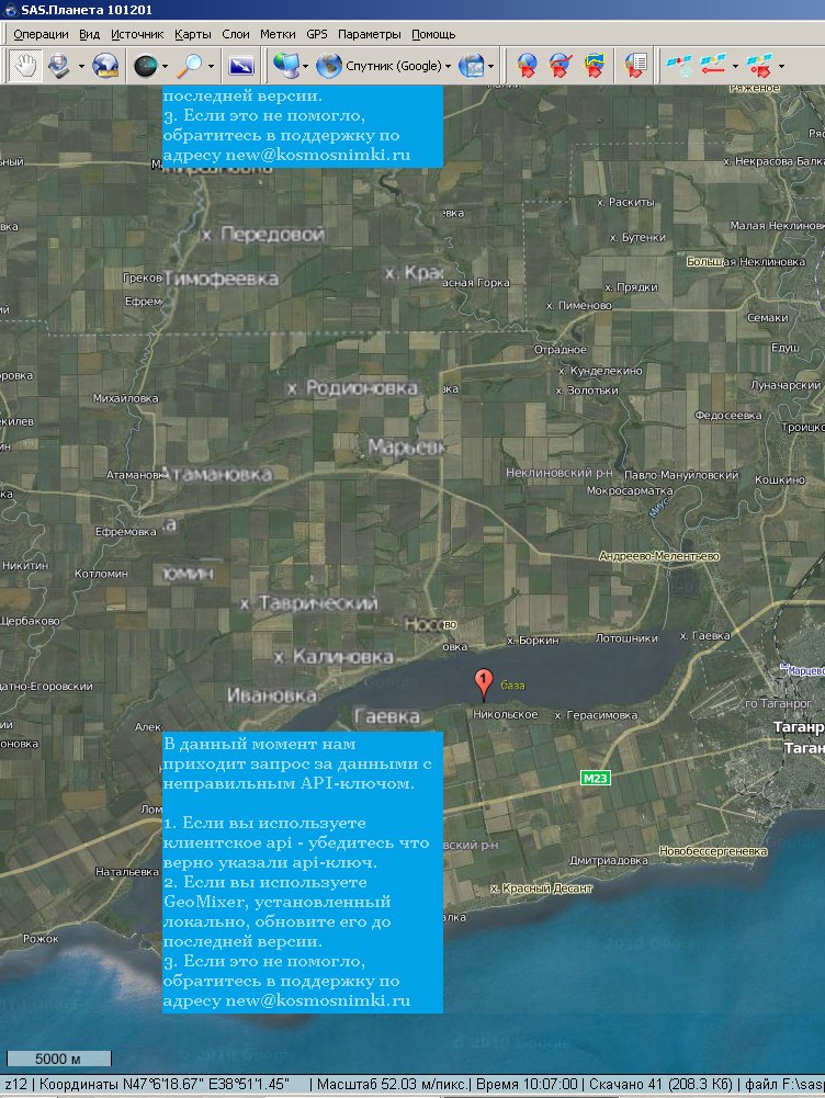 Приложил файл planeta.jpg. Здесь видны "старого образца" синие квадраты. Эти места я пытался обновить, и - внимание: над нижним квадратом видно два размытых, так вот нижний из них - это я жал "удалить" на нижней половине нижнего синего квадрата, а верхний - на его же верхней половине. Получается, удаляются не те тайлы, на которых стоит мышь. А вот "загрузить новый тайл" - вроде работает. |