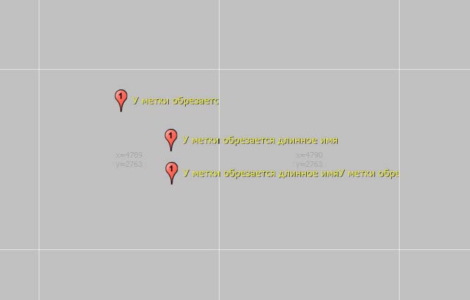 | Description | Если метка находится относительно середины тайла левее, а имя выходит за пределы данного тайла, то имя обрежется по правому краю данного тайла. А если правее, то имя обрежется, только если оно будет выходить за пределы соседнего правого тайла (по его правому краю). Наверное написал не совсем непонятно. Прилагаю картинку. | ||||||||
